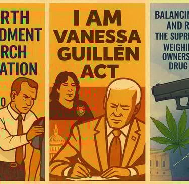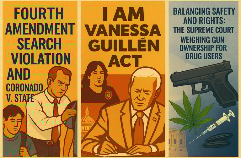 These three featured articles explore how constitutional protections and human rights are tested in different arenas of American law. Balancing Safety and Rights examines the Supreme Court’s review of whether federal bans on gun ownership for drug users align with the Second Amendment, highlighting the tension between public safety and individual freedoms. Unlawful Search revisits a Texas case where a student’s Fourth Amendment rights were challenged by a school search, raising questions about privacy and reasonableness in educational settings. Finally, I Am Vanessa Guillén tells the powerful story of a young soldier whose tragic death spurred landmark legislation reforming how the military handles sexual harassment and assault, ensuring accountability and protection for service members. Together, these pieces illuminate the ongoing struggle to reconcile liberty, security, and justice in American society.